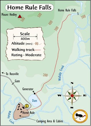 Map of walking trail to Home Rule Falls courtesy Footloose publications