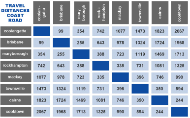 Distance chart for the Coastal route to Cooktown